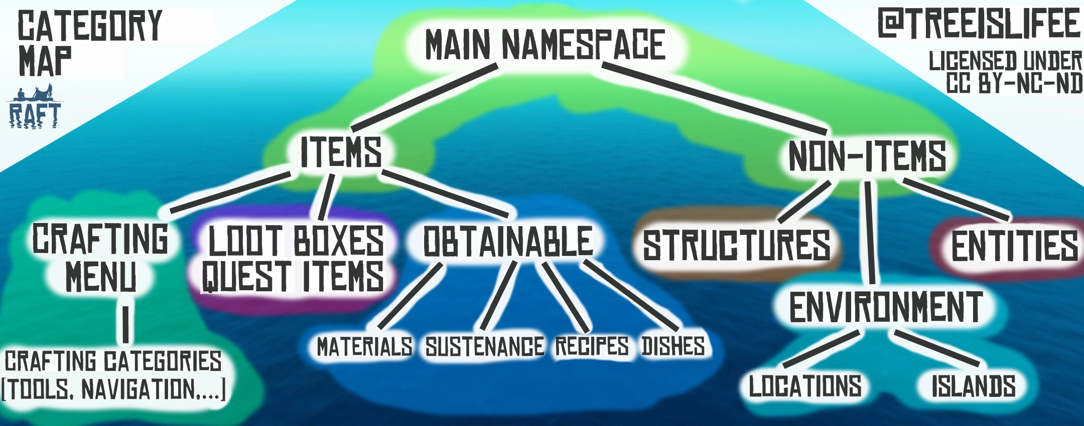 - Obtainable - can be only obtained outside of crafting menu and can exist in inventories. It is not marked as category, so categories listed below are categorized directly into the Raft category.