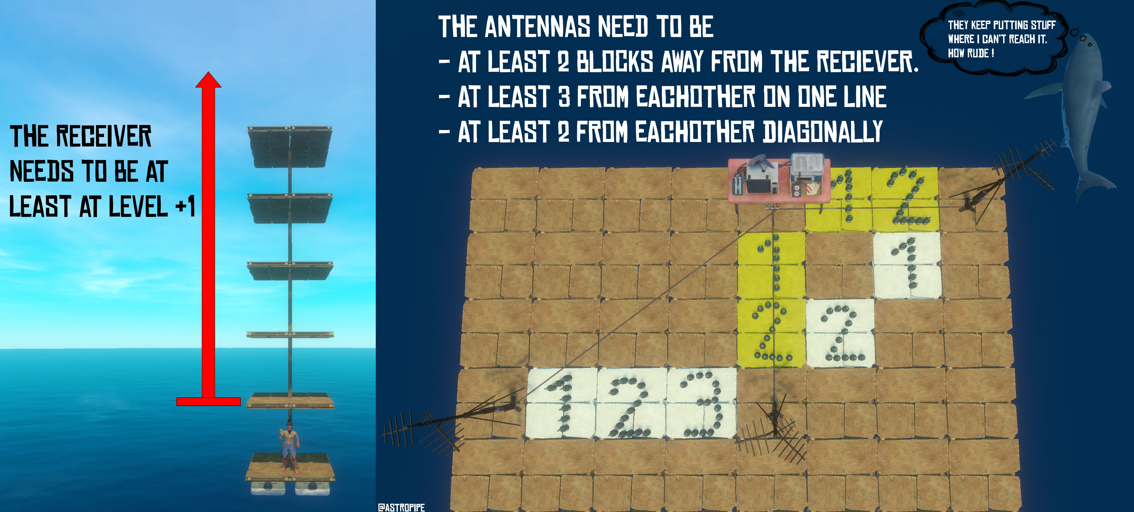 The Receiver must be placed at least one full floor above Foundation level (a single Pillar's height) and all three Antennas must be placed on the same floor as the Receiver, or one half level above or below. All Antennas must be placed at least 2 Foundation's length[note 1] away from the Receiver, while all being roughly 3½ Foundation's length[note 2] away from each other. The Antennas can be placed a maximum of 10 Foundation's length[note 3] away from the receiver before being too far away.
