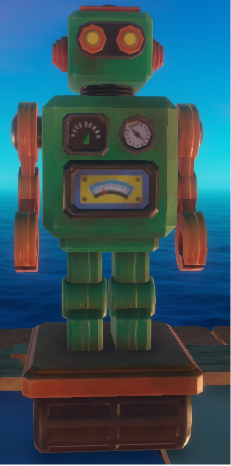 Toy Robot is a decoration object that can be found through Treasure Hunting. It is found in the Safes that can be dug up. Every time a Safe is dug up, there is a 2.3% chance that it is a Toy Robot. However, there are two robots; a regular and a Golden Toy Robot. When rolling the 2.3% chance of getting a robot in the first place, the game later decides whether it is a gold or regular robot. The regular Toy Robot has a 94.8% drop chance with the remaining 5.2% being the Golden Toy Robot's drop chance. Given that the chance of digging up a Safe is 1 in 5, this translates to approximately a 1 in 4181 chance that any excavated treasure will contain a Golden Toy Robot.